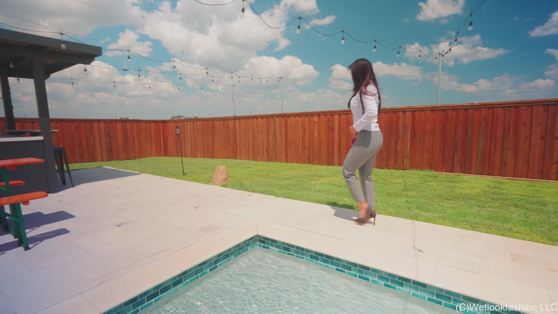 Alexandra is by the pool, walking around wearing a white blouse with a bra, business pants, and heels. After showing off her outfit dry, she steps on the tanning ledge soaking her heels and she sits and lays on the edge of the hot tub, gradually splashing water over her. Once her blouse is soaked you can see her bra underneath. Her pants are soaking a lot slower, even once her pants are fully submerged in the water, they are still not soaked through completely. After splashing she gets up on the steps and dives in the water going under. She swims for a little bit and keeps dunking her head underwater and also swimming underwater. Next she poses some more on the tanning ledge and then moves back in the hot tub, going dunking under in there again. Before the clip ends she goes for another swim above and underwater, showing off her wet outfit last. Scene contains underwater footage.