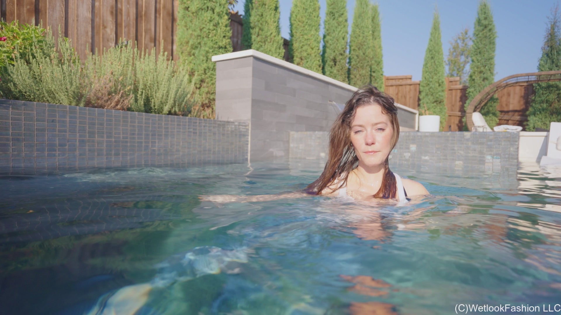 Rey is relaxing by the pool wearing Levi's jeans, white top with a black bra and flip flops. She moves over to the lounger by the pool before slowly walking into the pool. Once she is in the relaxes for a little bit until she goes underwater. She continues to swim dive and go underwater. She also hangs out in the spa and takes a shower to wash her hair at the end. Scene contains some underwater footage.