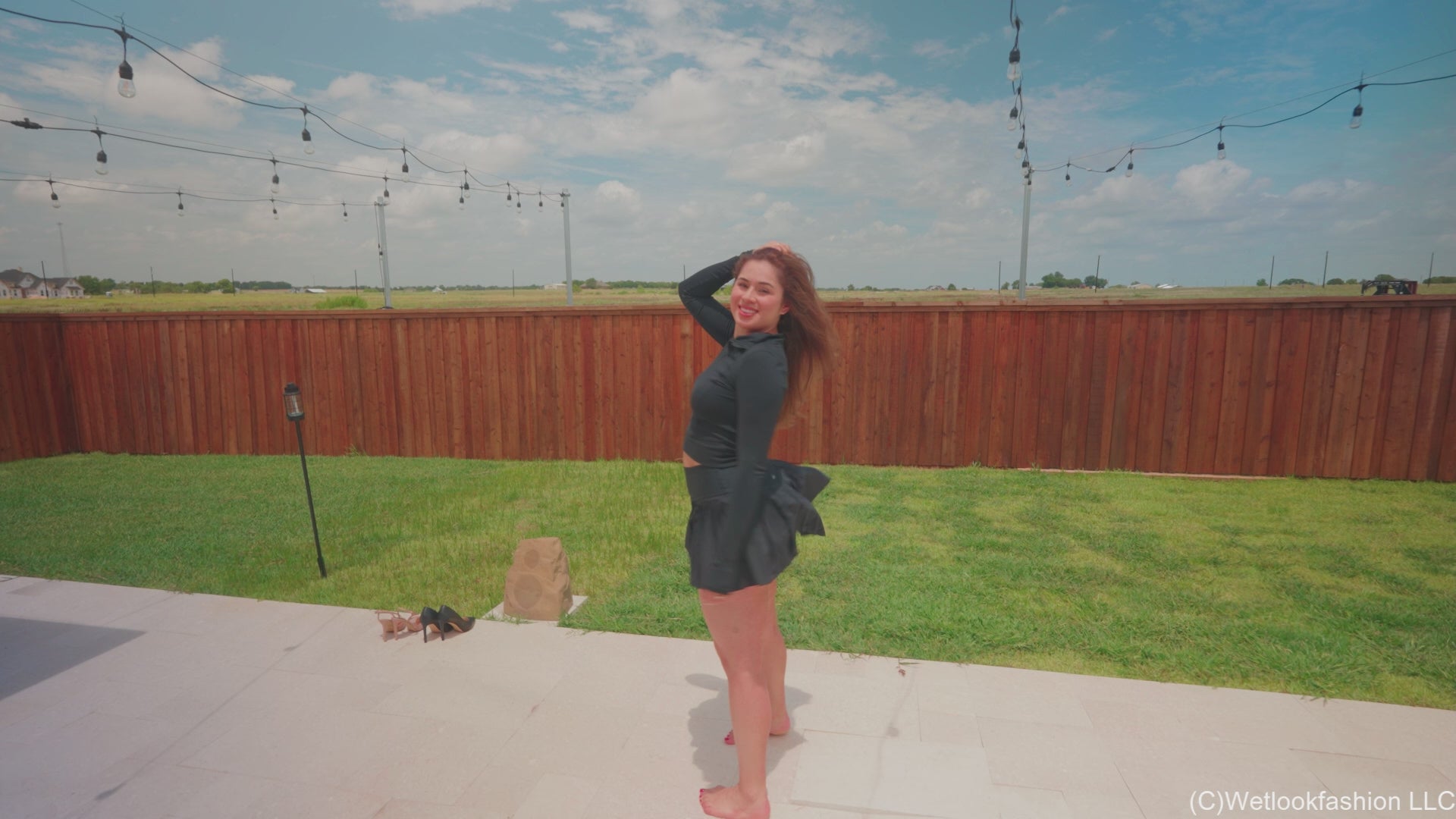 Samantha is stretching poolside, wearing a Alo skirt and a sports top. After a little bit of stretching, she goes for a walk, showing off her outfit and then she steps in the pool, just so the bottom of her skirt slightly touches the water. She comes back out, goes for another walk. Next times she steps in the pool, so only her shoulders and her hair stay dry. She comes back out and decides, that its time to dive in. Now all submerged in the water, she swims around, comes out a few times, hangs out in the spa and also swims underwater a few times. The scene is topped off with another dive and at the end showing off her shiny and clingy outfit.