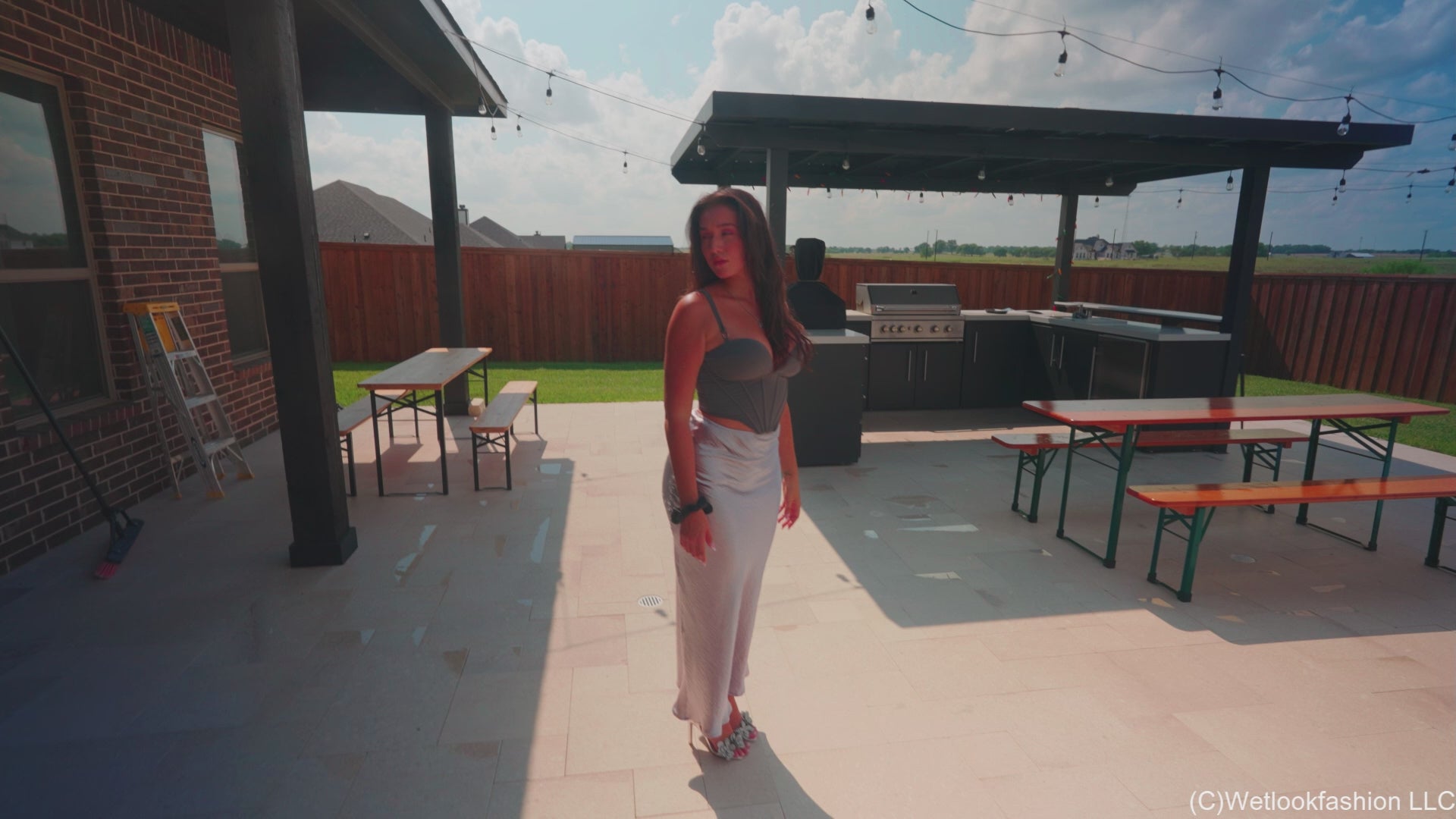 The beautiful Iris is by the pool wearing a shiny long skirt, a grey top and heels. She first walks around poolside, so we can check out her hot and shiny outfit while dry. After a little bit of walking, she steps in the pool by the tanning ledge. She walks in up to her boobs and then comes back out, showing us her partially wet outfit. Her skirt is now all clingy and even shinier. She goes back in and does the same thing again two more times, just keeping her hair dry. She then comes out and takes a jump, getting her hair wet as well. Now completely wet, she swims and floats in the water for a little bit, also coming out again and jumping back in. Next she goes in the hot tub, where she also dunks underwater. She returns to the pool for some more swimming, takes her heels off and she also lays on the tanning ledge, posing and playing with her wet hair. Before the clip ends she shows off her wet outfit and takes one final plunge. Scene contains brief underwater footage.